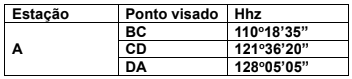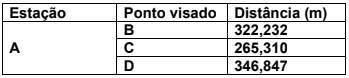 Sabendo que os ângulos medidos e distâncias entre os pontos visados são apresentados na Tabela 1, a área da poligonal é de aproximadamente: