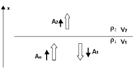A figura a seguir representa uma onda senoidal P, de amplitude Ao, propagando-se no meio 1, no sentido +x, incidindo na interface com o meio 2. A interface está na posição x = 0.
