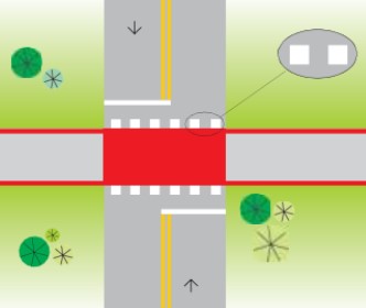 Em um cruzamento em nível entre a pista de rolamento de veículos e uma ciclovia, é necessária a marcação de cruzamento rodocicloviário (MCC) (figura a seguir). Em um cruzamento da cidade, observa-se que essa marcação foi feita com paralelogramos com base e altura (as duas dimensões da pintura) com 0,25 metros. Sobre isso, assinale a alternativa correta.