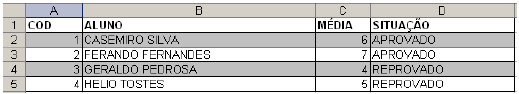 Considere que na escola em que esta planilha foi elaborada, a média para aprovação é 6. Assinale a alternativa que representa a função que pode ser utilizada para o preenchimento automático da situação do aluno (coluna D), de acordo com a média obtida (coluna C).
