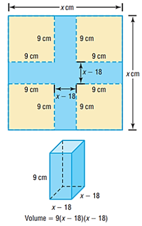 De cada canto de uma chapa metálica quadrada, remove-se um quadrado de 9cm de lado e constrói-se uma caixa, como ilustrado na figura abaixo: