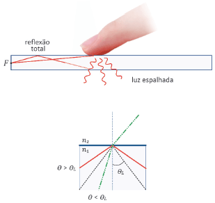 Uma das possíveis tecnologias para a produção de telas sensíveis ao toque aproveita a reflexão interna total da luz. Esse tipo de reflexão ocorre quando um raio luminoso viaja do interior de um meio 1, com índice de refração n1, em direção a um meio 2, com índice de refração n2, formando com a direção perpendicular à interface entre os meios um ângulo θ maior do que um certo valor limite θ_L , tal que \sin θ_L=n_2/n_1. Quando um objeto (como um dedo) se aproxima da interface entre os meios, a reflexão total não ocorre, o que é captado por sensores, revelando a posição do objeto. Suponha que se deseje projetar uma tela sensível ao toque que, conforme mostra a figura, funcione com uma fonte luminosa F fixa na borda. A tabela a seguir indica os índices de refração de alguns materiais candidatos à utilização no meio 1.