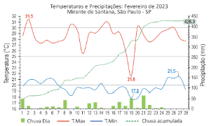 A Estação Meteorológica Mirante de Santana é a principal referência do Instituto Nacional de Meteorologia (INMET) no município de São Paulo - SP. O climograma a seguir apresenta dados referentes ao mês de fevereiro de 2023. Neste mesmo mês, o Centro de Gerenciamento de Emergências Climáticas detectou 11 pontos de alagamentos no dia 19 e 14 pontos no dia 21.