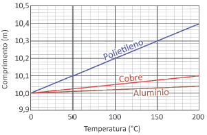 Quando uma barra de um certo material é aquecida até uma temperatura T a partir de uma temperatura inicial T0, seu comprimento inicial L0 sofre um aumento \Delta L dado por \Delta L= \ , L_0(T-T_0), sendo a o coeficiente de expansão linear, que depende do material. O gráfico a seguir mostra curvas de expansão linear para barras feitas de três materiais distintos.