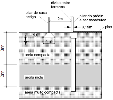 O desenho acima esquematiza uma estaca a ser executada junto à divisa entre dois terrenos, como parte das fundações de um prédio a ser construído. A 2 m de distância desse prédio, existe uma casa antiga. O desenho mostra também um dos elementos de fundação da casa: uma sapata quadrada, com 1 m de lado. O pilar do prédio tem largura de 0,15 m e a estaca tem diâmetro de 0,40 m. De acordo com essas informações e para as condições apresentadas, julgue o item a seguir.