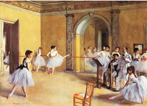 Do interior da Ópera de Paris, Degas retratou diversas cenas, como as da imagens acima. Usando movimentos, cores e pinceladas suaves, compôs suas telas, onde bailarinas com suas sapatilhas e seus tutus volumosos, fazem exercícios na barra ou apresentam seus movimentos graciosos, enquanto o professor e o músico da aula avaliam seus desempenhos.