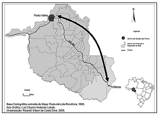 Centro de produção de soja (Vilhena) e o centro de gestão dos fluxos (Porto Velho) interligados pela BR-364