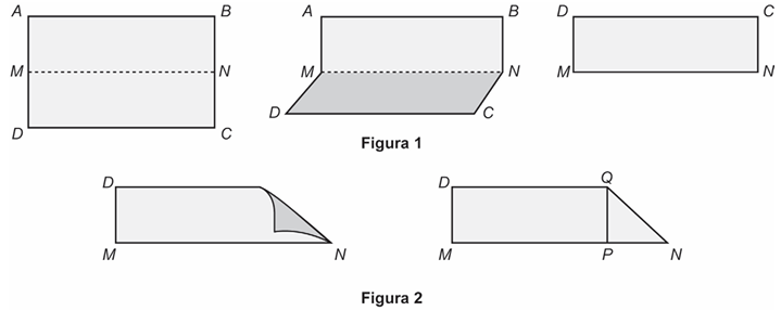 Na construção de um avião de papel, uma criança dobrou uma folha retangular sobrepondo o lado DC ao lado AB. Assim, ela obteve dois novos retângulos, sendo um deles o retângulo DCNM, conforme a figura 1. Em seguida, ela fez uma nova dobradura, mantendo N fixo e sobrepondo o lado CN, de DCNM, a um segmento de MN. Essa sobreposição determinou um ponto P em MN e também um ponto Q em DC, conforme a figura 2.