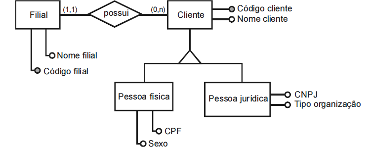 No modelo representado no diagrama acima, a implementação de hierarquias de generalização na abordagem relacional pode ser feita usando-se uma tabela para cada entidade ou uma única tabela para toda a hierarquia de generalização/especialização.