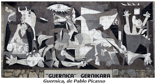 O quadro pintado, por Pablo Picasso, em 1937, no contexto de escalada do fascismo, na Europa, retrata, especificamente, a ascensão ao poder de