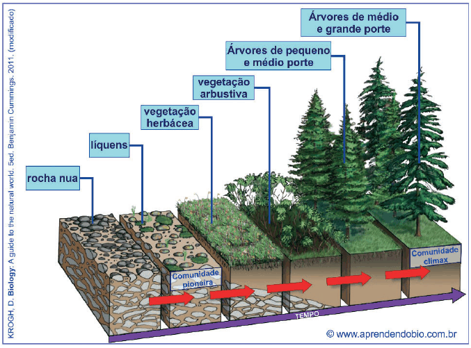 Nos ecossistemas atingidos pelo fogo, ocorre um processo lento de regeneração natural, gradual, com alterações na estrutura e na composição das comunidades, representado por um procedimento ordenado de mudanças, incluindo modificações no ambiente físico pela comunidade biológica, até alcançar a fase de clímax, como visto na figura.
