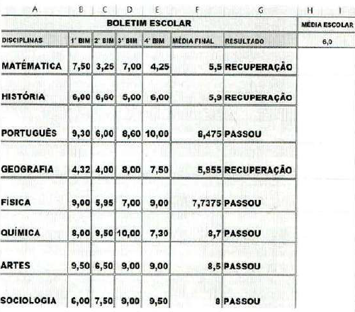 Na Escola ABC, os professores usam o Microsoft Excel (2016 - x64) para registrar as notas dos alunos e determinar se eles atingiram os resultados esperados. A planilha contém as notas de quatro bimestres de um determinado aluno ao longo do ano: