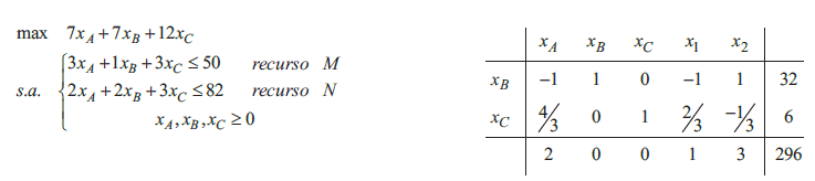 Uma empresa fabrica 3 produtos A, B e C que lhe proporcionam lucros de R$ 7,00, R$ 7,00 e R$ 12,00 por quilograma. Para produzi-los, utiliza dois tipos de matéria-prima M e N, cujas disponibilidades são 50 e 82 litros. A empresa, desejando maximizar seu lucro e respeitando sua disponibilidade de matéria-prima, elabora um modelo de programação linear para determinar o número de unidades de cada produto a ser fabricado. A solução do modelo, resolvido como um problema de minimização, é apresentada abaixo, onde x1 e x2 são as folgas das restrições relativas a M e N, respectivamente.