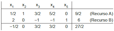 O tableau acima indica uma iteração qualquer do Algoritmo Simplex na solução do problema, onde x1, x2 e x3 são as quantidades produzidas de gás, óleo e gasolina bruta, respectivamente, e x3 e x4 são as folgas das restrições relativas aos recursos A e B. A partir do tableau afirma-se que as variáveis