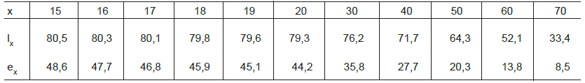 Seja uma determinada população masculina sujeita à lei de mortalidade dada pelo trecho da tábua de vida acima (valores de lx por 1.000). Qual o número total de anos vividos pelo conjunto de indivíduos do grupo de 15 a 19 anos?