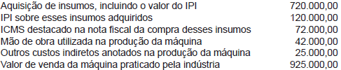 A empresa Industrial T, que produz máquinas de alta tecnologia, para aumentar a geração de seus benefícios econômicos, decidiu destinar uma máquina de sua produção para uso próprio, fazendo as seguintes anotações referentes, exclusivamente, à produção dessa mesma máquina: