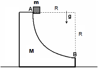 Um corpo de massa de m é abandonado a partir do repouso, no ponto A, conforme a figura. O corpo atinge o ponto B somente deslizando pela superfície sem atrito do corpo de massa M. Não há atrito entre o bloco M e a superfície de contato, e M = 4 m.