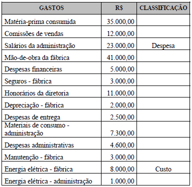 O primeiro passo na contabilidade de custos é a separação entre custos e despesas; depois procede-se à apropriação dos custos diretos e indiretos. Considerando que o quadro apresentado indica os gastos realizados por uma fábrica em determinado período, é correto afirmar que os custos no período totalizaram