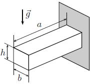 O módulo de Young de um material mede sua resistência a deformações causadas por esforços externos. Numa parede vertical, encontra-se engastado um sólido maciço de massa específica \rho e módulo de Young \varepsilon, em formato de paralelepípedo reto, cujas dimensões são indicadas na figura. Com base nas correlações entre grandezas físicas, assinale a alternativa que melhor expressa a deflexão vertical sofrida pela extremidade livre do sólido pela ação do seu próprio peso.