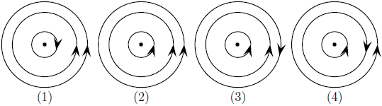 As figuras mostram três espiras circulares concêntricas e coplanares percorridas por correntes de mesma intensidade I em diferentes sentidos. Assinale a alternativa que ordena corretamente as magnitudes dos respectivos campos magnéticos nos centros B_1, B_2, B_3 e B_4.