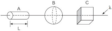 Um fio de densidade linear de carga positiva λ atravessa três superfícies fechadas A, B e C, de formas respectivamente cilíndrica, esférica e cúbica, como mostra a figura. Sabe-se que A tem comprimento L= diâmetro de B= comprimento de um lado de C, e que o raio da base de A é a metade do raio da esfera B. Sobre o fluxo do campo elétrico, \Phi, através de cada superfície fechada, pode-se concluir que