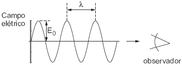 Uma onda eletromagnética com um campo elétrico de amplitude E_o, frequência f e comprimento de onda λ = 550 \, nm é vista por um observador, como mostra a figura. Considere as seguintes proposições: