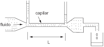 A figura abaixo representa um sistema experimental utilizado para determinar o volume de um líquido por unidade de tempo que escoa através de um tubo capilar de comprimento L e seção transversal de área A. Os resultados mostram que a quantidade desse fluxo depende da variação da pressão ao longo do comprimento (ΔP/L), do raio do tubo (a) e da viscosidade do fluído (η) na temperatura do experimento. Sabe-se que o coeficiente de viscosidade (η) de um fluído tem a mesma dimensão do produto de uma tensão ( força por unidade de área) por um comprimento dividido por uma velocidade.