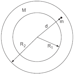 Uma casca esférica tem raio interno R_1, raio externo R_2 e massa M distribuída uniformemente. Uma massa puntiforme m está localizada no interior dessa casca, a uma distância d de seu centro (R_1 < d < R_2). O módulo da força gravitacional entre as massas é