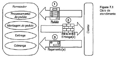 Cadeia de suprimentos é a rede complexa de atividades que acaba por entregar um produto ou serviço final ao cliente, incluindo elementos de dentro e de fora da empresa. A partir da figura acima, que apresenta as etapas do ciclo de atendimento, assinale a alternativa correta.