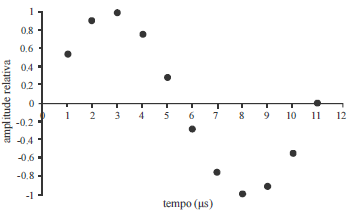 Considere que determinado sinal eletrônico seja amostrado em 11 instantes de tempo igualmente espaçados, conforme ilustrado na figura abaixo. Para obter uma representação contínua e precisa desse sinal no intervalo de tempo considerado, é preferível utilizar a interpolação polinomial de grau 10 à interpolação do tipo BSpline cúbica.