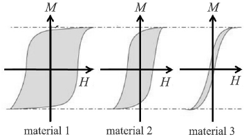 Considerando-se a figura abaixo, que exibe as curvas de histerese de três materiais magnéticos distintos, em que M refere-se à magnetização do material e H corresponde à intensidade do campo magnético aplicado, é correto afirmar que o material 3 é o mais apropriado para utilização em elementos de memória.