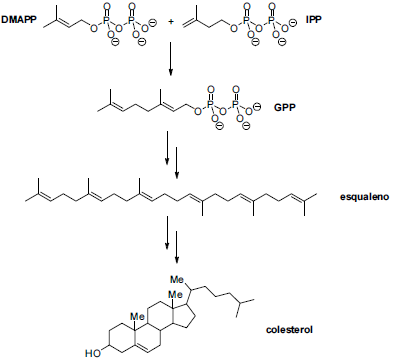 O processo de biossíntese do colesterol inicia-se na reação entre dimetilalilpirofosfato (DMAPP) e isopentenilpirofosfato (IPP). O produto dessa reação é o geranilpirofosfato (GPP) que, além de conduzir à síntese de colesterol, por meio da formação de esqualeno, também origina a vasta classe dos terpenos. Com relação às reações envolvidas na síntese do colesterol e às estruturas químicas dos compostos relacionados descritas na figura acima, julgue o item a seguir.