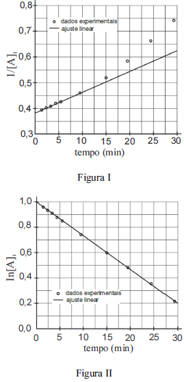 As figuras acima mostram os ajustes lineares dos dados experimentais da variação da concentração de [A] em função do tempo t.