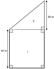 A figura representa o terreno I, de formato retangular, cuja área é 2 000 m2, e o terreno II, com a forma de um triângulo retângulo, que foram unidos para a construção de um condomínio.