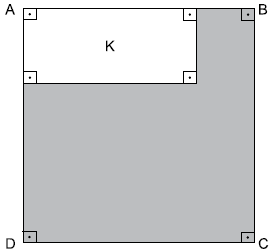 A figura mostra um canteiro retangular K, que ocupa 21 m2 da área total de um jardim quadrado ABCD.