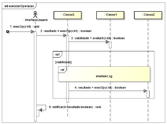 Considere o diagrama de sequência, abaixo, de uma aplicação hipotética, que detalha o caso de uso executarOperacao desta aplicação. Tal aplicação possui outro caso de uso, atualizarLog, referenciado no diagrama de sequência.