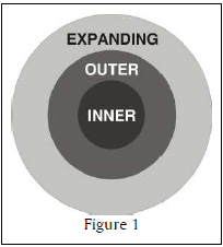 Graddol’s research shows that “Global English has led to a crisis of terminology. The distinctions betwee ‘native speaker’, ‘second-language speaker’, and ‘foreign-language user’ have become blurred. One of the most familiar ways of representing the global community of English speakers is in terms of three circles. (figure 1)