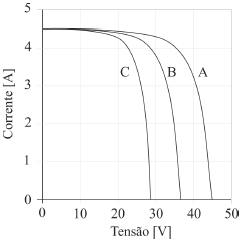 As variáveis de temperatura e irradiância são as principais grandezas responsáveis para a definição dos valores de tensão e corrente em um painel fotovoltaico. A figura abaixo mostra curvas clássicas retiradas da folha de dados de um painel fotovoltaico.