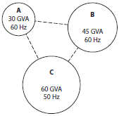 Na figura abaixo estão representados, de forma esquemática, os sistemas elétricos de três países A, B e C, com indicação das respectivas potências do parque gerador instalado (em GVA) e frequência nominal de operação (em Hz) de cada sistema.