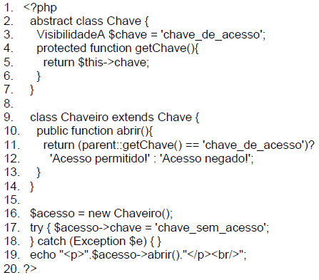 Para que o código apresentado possa exibir, ao final de sua execução, a frase 'Acesso permitido!', mas sem que outra classe possa alterar o valor do atributo $chave, a declaração Visibilidade A (linha 3) deve ser alterada para: