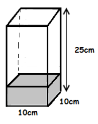 Um recipiente na forma de um prisma reto de base quadrada, com dimensões internas de 10 cm de aresta da base e 25 cm de altura, está com 20% de seu volume total preenchido com água, conforme mostra a figura. (Figura fora de escala)