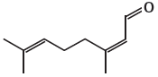O citral, substância de odor fortemente cítrico, é obtido a partir de algumas plantas como o capim-limão, cujo óleo essencial possui aproximadamente 80%, em massa, da substância. Uma de suas aplicações é na fabricação de produtos que atraem abelhas, especialmente do gênero Apis, pois seu cheiro é semelhante a um dos feromônios liberados por elas. Sua fórmula molecular é C_{10}H_{16}O, com uma cadeia alifática de oito carbonos, duas insaturações, nos carbonos 2 e 6; e dois grupos substituintes metila, nos carbonos 3 e 7. O citral possui dois isômeros geométricos, sendo o trans o que mais contribui para o forte odor.