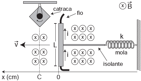 Desenvolve-se um dispositivo para abrir automaticamente uma porta no qual um botão, quando acionado, faz com que uma corrente elétrica i = 6 A percorra uma barra condutora de comprimento L = 5 \, cm, cujo ponto médio está preso a uma mola de constante elástica k = 5 \times 10^{–2}\, N/cm. O sistema mola-condutor está imerso em um campo magnético uniforme perpendicular ao plano. Quando acionado o botão, a barra sairá da posição de equilíbrio a uma velocidade média de 5\, m/s e atingirá a catraca em 6 milisegundos, abrindo a porta.