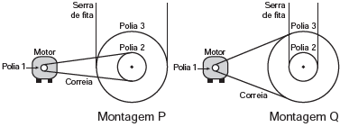 Para serrar ossos e carnes congeladas, um açougueiro utiliza uma serra de fita que possui três polias e um motor. O equipamento pode ser montado de duas formas diferentes, P e Q. Por questão de segurança, é necessário que a serra possua menor velocidade linear.