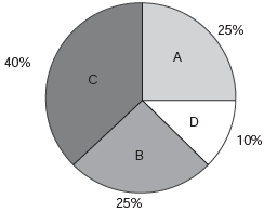 Foi realizado um levantamento nos 200 hotéis de uma cidade, no qual foram anotados os valores, em reais, das diárias para um quarto padrão de casal e a quantidade de hotéis para cada valor da diária. Os valores das diárias foram: A = R$ 200,00; B = R$ 300,00; C = R$ 400,00 e D = R$ 600,00. No gráfico, as áreas representam as quantidades de hotéis pesquisados, em porcentagem, para cada valor da diária.