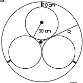 Em um sistema de dutos, três canos iguais, de raio externo 30 cm, são soldados entre si e colocados dentro de um cano de raio maior, de medida R. Para posteriormente ter fácil manutenção, é necessário haver uma distância de 10 cm entre os canos soldados e o cano de raio maior. Essa distância é garantida por um espaçador de metal, conforme a figura: