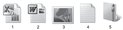 O conjunto de imagens a seguir mostra 5 ícones de tipos de arquivos/pastas num computador com MS-Windows 7, em sua configuração padrão, numerados de 1 a 5.