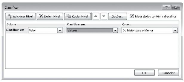 Depois, selecionou um intervalo, acionou o recurso Classificar Dados e escolheu as opções, conforme a imagem a seguir.