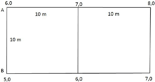 Analise a figura a seguir e indique o volume de corte, calculado segundo a fórmula de prisma, se o projeto exige uma plataforma horizontal na cota 4.