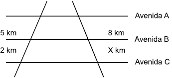 Três avenidas paralelas são cortadas por duas transversais. Analise o gráfico seguinte e responda quantos km mede X?